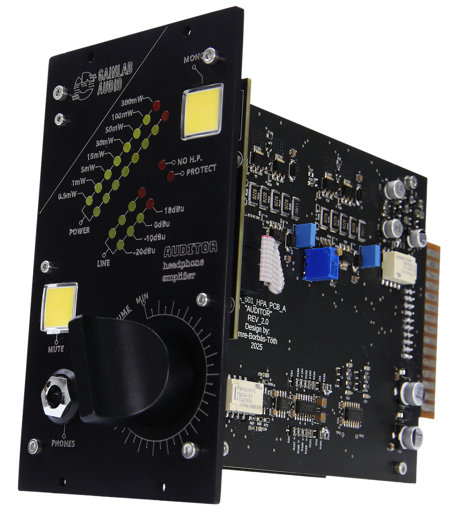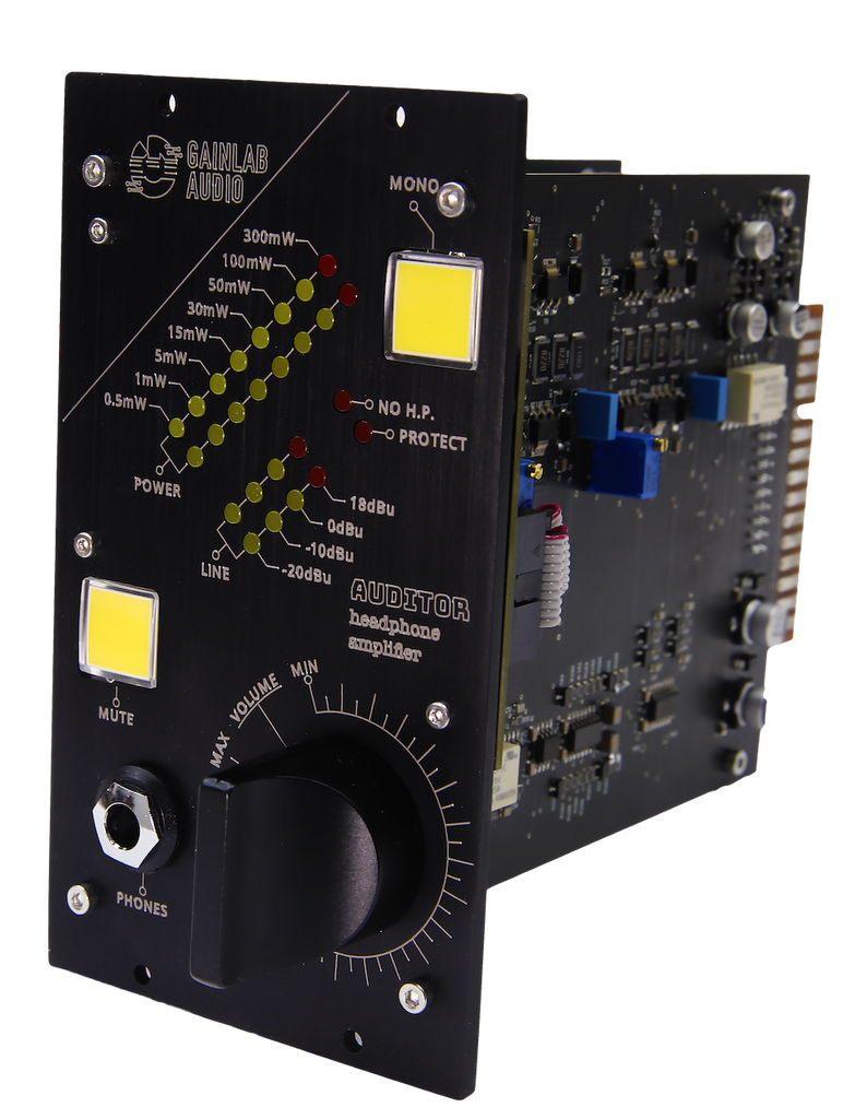 The Gainlab Audio Auditor is a professional 500-series headphone amplifier designed to fit into a standard 500-series chassis, engineered for both studio and field applications. In the professional audio world, the 500-series format is often chosen by those who want their proven systems in a compact and easily portable form. Our experience shows that one of the most essential companions in such setups is a reliable headphone amplifier and the Auditor was designed with exactly this role in mind.