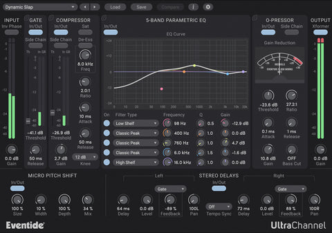 The Eventide UltraChannel is a channel strip plug-in, which brings you some of the company's legendary effects in a compact yet intuitive environment, in addition to offering familiar processors such as gain, gate, EQ, and compressor/de-esser. It features a Micro Pitch Shift module with functionality from the H8000FW Ultra-Harmonizer, ideal for widening tracks like guitars, synths, and vocals, a stereo delay module with variable feedback paths, built-in analog soft-saturation and transformer emulation, and the O-Pressor, a simplified version of the original Eventide Omnipressor capable of aggressive compression for adding just the right amount of character to your sound.